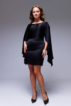Элегантное платье А-образного силуэта. Выполнено из шелковистой ткани средней плотности с атласным блеском. Платье отрезное по талии. Верх платья свободный с цельнокроеным рукавом-крылышком. По плечам аккуратная драпировка. По спинке застежка на потайную молнию. Платье на подкладке. Длина платья от плечевого шва 126см Длина рукава 33см.