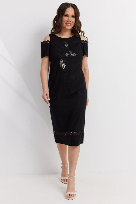 Элегантное платье  прямого силуэта. Выполнено из смесовой натуральной ткани. Дополнено красивой вышивкой и декоративными тесьмами. По спинке застежка на потайную молнию. Длина платья от плечевого 110 см. Длина рукава 20см.