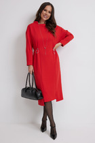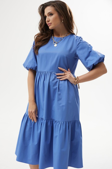 Платье А-силуэта с завышенной талией. Горловина округлой формы. Рукав расширенный к низу, на резинке. Спинка со средним швом с застежкой на воздушную петлю и пуговицу. Юбка состоит из двух объемных присборенных воланов.