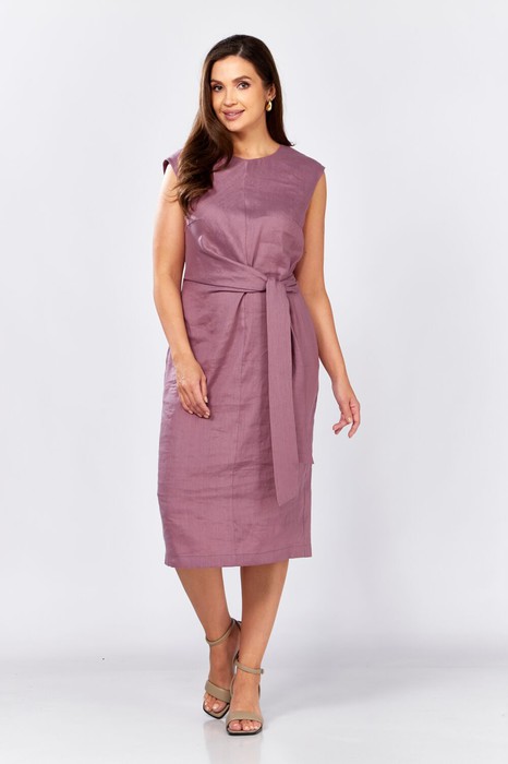 Платье полуприлегающего силуэта , слегка зауженное к низу. Спинка со средним швом и шлицей. Горловина округлой формы , по спинке с застёжкой на пуговицу и навесную петлю.По переду средний шов , нагрудные вытачки, на уровне талии декоративные складки, переходящие в пояс.