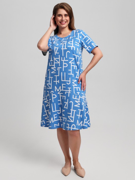 Платье женское из трикотажного полотна «кулирка» с набивным рисунком, полуприталенного силуэта, с короткими втачными рукавами, горловиной овальной формы, карманами в боковых швах. Низ изделия с воланом ассиметричной формы.
