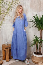 Нарядное платье свободного силуэта выполнено из плиссированной ткани, поставлено на трикотажную подкладку.  На полочке обработаны подрезы, края заработаны флешем. Рукав втачной, до локтя, слегка расклешен. Спинка идентична полочке, горловина окантована. Платье декорирована цветком. В этом платье прекрасно скрываются все недостатки фигуры, а благодаря легкости ткани ваш образ будет воздушным и нежным!