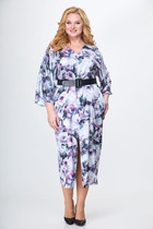 Летнее, отрезное по линии талии платье с расширенной к низу юбкой. Лиф платья выполнен из эластичной хлопковой ткани, юбка платья из плательной ткани на подкладке из хлопка. Платье с коротким втачным рукавом и отложной манжетой. По лифу переда платья рельефы, по спинке талиевые вытачки и средний шов. Лиф платья украшен брошью ручной работы. По талии платья пояс из отделочной ткани.