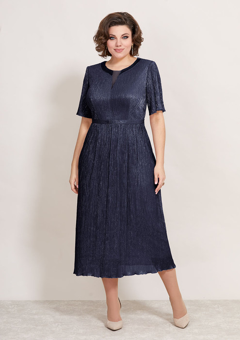 Эффектное женское платье, полу-прилегающего силуэта, выполнено из плиссированной ткани, на трикотажной подкладке. Лиф платья отрезной по линии талии, горловина округлой формы, на обтачке, также на горловине обработаны втачные планки из атласа в тон и декорированы стразами. По линии горловины выполнена вставка из сетки, что придает платье еще больше эффектности, по линии талии втачной пояс из основной ткани, декорирован стразами. Юбка присборена по линии талии и расклешена к низу, спинка отрезная по линии талии, со средним швом и вытачками. Рукав втачной, выполнен з основной ткани, укороченный. Стильное платье, то, что надо для торжественного мероприятия!