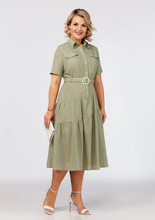 Стильное платье полу-прилегающего силуэта, выполнено из летней ткани с эффектом «тай-дай». Горловина платья обработана воротником, застежка по переду на планку с пуговицами. На полочке обработаны кокетки и рельефы с двойной отстрочкой, также в шов кокетки вставлены клапаны. Юбка платья имеет ассиметричный подрез ниже линии талии, состоит из двух, присбореных воланов. Спинка идентична полочке, с кокеткой, рельефами, по линии талии настрочены шлевки и в комплект входит съемный пояс из основной ткани, с пряжкой. Рукав втачной, укороченный, на спинке выполнена объемная аппликация. Стильное платье для ценителей комфорта в сочетании с оригинальным кроем!
