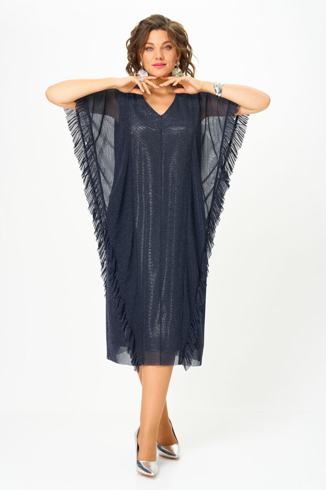 Женское платье полу-прилегающего силуэта,  выполнено из сетки с люрексовой полоской с серебристой подкладкой. Горловина V-образной формы, обтачена, на полочке выполнен средний шов, также  выполнены вертикальные подрезы, в них втачены отлетные детали с рюшей. Отлетные элементы по боковым подрезам прекрасно скрывают некоторые недостатки фигуры и визуально делают силуэт стройнее. Спинка идентична полочке, как и полочка, выполнена из сетки с люрексовой полоской, в качестве подкладки серебристый текстиль. Элегантное платье из эффектной ткани и оригинальным кроем отлично подчеркнёт достоинства фигуры и сделает ваш образ стильным.