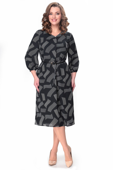 Платье на подкладке свободного силуэта с V-образным вырезом горловины. По переду мягкая складка декорированная металлическим пришивным элементом. Рукав втачной одношовный с резинкой по низу. Изделие дополнено съемным ремнем. Длина платья по спинке-108 см. Длина рукава 48 см.