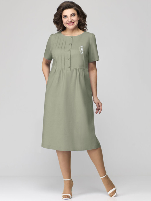Платье с частичной застежкой на петли и пуговицы. По левой части переда накладной карман и подрез, по правой части переда декоративные защипы. В боковых швах карманы. Спинка с защипами по верху. Рукав втачной короткий с небольшой сборкой по верху. Длина платья 108 см, длина рукава 26 см