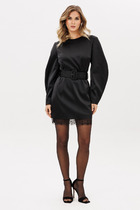 Платье женское А-силуэта длины миди. Отрезное по линии талии, на кулисе. Кокетка переда спинки из отделочной натуральной льняной ткани. Мужду кокеткой и лифом настрочено кружево. Лиф платья с застежкой на пуговицы и нависные петли. Карманы в боковых швай. Воротник стойка, рукав втачной со сборкой по окату, заканчивается воланом на резинке-венгерке. Платье на подкладке из хлопка с регулируемыми брителями.