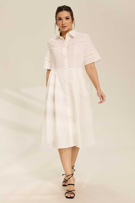 Платье полуприлегающего силуэта, отрезное по линии талии, застежка центральная (обработана притачной планкой) на петли-пуговицы. Лиф переда с фигурными рельефами. По линии талии в нижней части расположены складки. Лиф спинки с талиевыми вытачками, рукав одношовный втачной, слегка расклешенный. По нижней части спинки, рукава и по кокетке переда вставлена декоративная ткань с отделочной тесьмой. Воротник рубашечного типа с отрезной стойкой. По краю воротника и краю карманов настрочена декоративная тесьма. Платье на подкладке