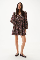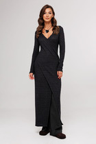 Платье полуприлегающего силуэта, отрезное по линии талии, застежка центральная (обработана притачной планкой) на петли-пуговицы. Лиф переда с фигурными рельефами. По линии талии в нижней части расположены складки. Лиф спинки с талиевыми вытачками, рукав одношовный втачной, слегка расклешенный. По нижней части спинки, рукава и по кокетке переда вставлена декоративная ткань с отделочной тесьмой. Воротник рубашечного типа с отрезной стойкой. По краю воротника и краю карманов настрочена декоративная тесьма. Платье на подкладке. Дополнением служит пояс.