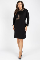Платье полуприлегающего силуэта с рукавом реглан. Горловина переда обработана притачной планкой. Перед с вертикальными рельефами. Центральная деталь переда из отделочной ткани. Спинка с талиевыми вытачками и со средним швом. Застежка на потайную молнию.