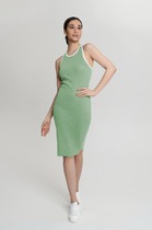 Платье женское приталенного силуэта, отрезное по линии талии. По лифу переда и спинки расположены рельефы. Юбка расклешенная с разрезом по переду. Застежка на потайную тесьму-молнию в среднем шве. Дополнительной застежкой служит шнуровка корсетного типа по спинке. Рукава съемные, держатся на резинке.