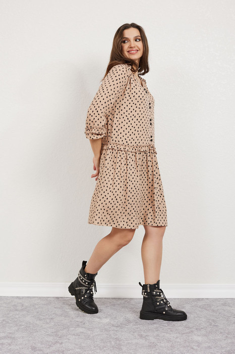 Платье женское свободного силуэта отрезное ниже линии талии, выполнено из плательной ткани. Перёд платья с фигурными кокетками и центральным швом.  Спинка со средним швом и застёжкой на потайную молнию. Горловина V-образная. Рукава одно шовные втачные со сборкой по низу.  Платье без подкладки. Украшением платья служат рюши и декоративные пуговицы.