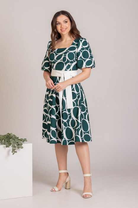 Платье женское полуприлегающего силуэта отрезное по линии талии. Лиф переда с нагрудными и талевыми вытачками. По спинке рельефы от проймы до талии. Горловина фигурная. По среднему шву спинки сверху застёжка потайная молния. Юбка расклешённая. Рукав одношовный втачной. Низ и окат рукава со сборками. Изделие дополняет пояс кушак. Платье без подкладки.