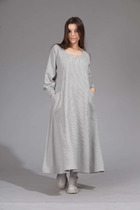 Платье женское свободного силуэта, отрезное по линии талии, расклешённое к низу, выполнено из ткани шифон. По линии талии сборка на резинку «венгерку». Горловина v-образная с небольших рюшей по переду до линии талии на завязках. Рукава одно шовные втачные, по низу сборка на резинку «венгерку». Платье на тонкой трикотажной подкладке.