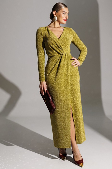 Блеск софитов, огни салютов, игривые пузырьки в бокале - и Ваше сияние обеспечено нашим вечерним платьем! Это действительно озорно, игриво, празднично! И, как ни крути, приковывает взгляды! Представленное платье приталенного силуэта. Спинка с талиевыми вытачками. Перед отрезной по линии талии. Лиф с эффектным V-образным вырезом и узлом в области талии. Юбка на запах. Рукав полуреглан, присборенный на резинку в нижней части (по шву). Платье на подкладке. Материал платья - тонкий трикотаж с блеском. Хорошо тянется.