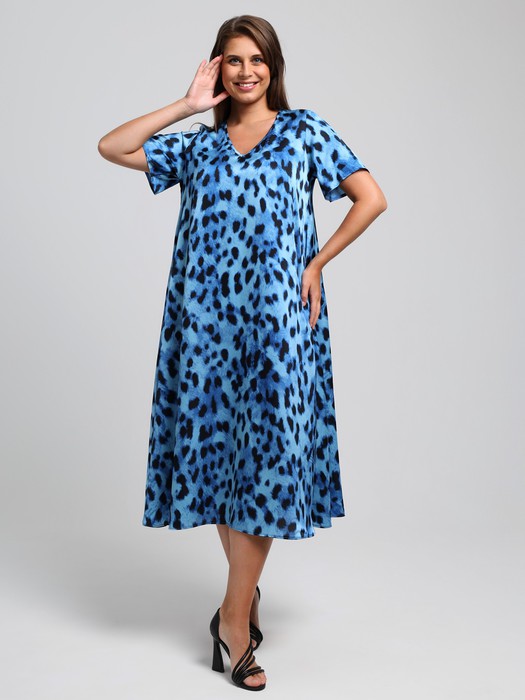 Платье женское из тканого полотна «искусственный шёлк полиэстер» с набивным рисунком, свободного покроя, удлиненное, по боковым швам расклешенное книзу, с V-образным вырезом горловины, окантованным основным материалом и короткими втачными рукавами.