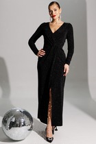 Платье комбинированное длиной макси, отрезное по линии талии с цельнокроеными рукавами. Застежка центральная с цельнокроеными планками на петли и пуговицы. Верхние части переда и спинки с вертикальными рельефами, начинающимися от линии плеча. Бантовая складка расположена по центру, боковые складки направлены от центра изделия в сторону бокового шва. Рукав цельнокроеный с боковыми частями переда и спинки с углубленной до линии талии проймой. По центру оката рукава сборка. Нижний срез рукава обработан притачной манжетой. Застежка манжеты на петли и пуговицы. Платье по линии талии собрано на резинку. Горловина изделия круглой формы, обработана воротником-стойкой, с застежкой на петли и пуговицы. Платье дополнено съёмным бантом. Бант съёмный, продевается в шлевки, расположенные на воротнике-стойке. В комплект к изделию идёт ремень из экокожи.