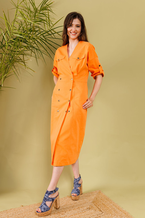Эффектное двубортное платье длиной миди из облегчённого денима полуприлегающего силуэта. Линия плеча приспущена, рукав втачной три четверти с манжетой и патой. Горловина обработана обтачкой с V-образным вырезом. Линия талии акцентирована притачным поясом. Имеются карманы в боковых швах. Изделие застёгивается на кнопки. Без подкладки.