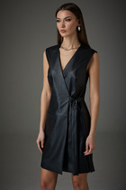 Платье свободного прямого кроя из вискозного полотна. Рукав втачной, планка по горловине. Вырез круглый. Низ изделия и рукавов имеют плоский шов. В боковых швах разрезы.