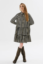 Платье свободного силуэта с фигурным лифом, на молнии по спинке, отрезное по линии талии. Горловина с V-образным вырезом. Рукава втачные три четверти. По переду подрезы по талии. Изделие на подкладке. В комплект к изделию идёт авторская съёмная брошь ручной работы.