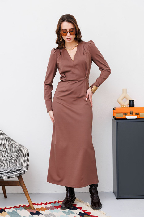 Элегантное платье приталенного силуэта, слегка расширенное к низу. Отрезное по линии талии. На деталях переда и спинки отрезные кокетки. На детали переда средний шов. По верхнему краю и на участке талиевого шва деталей переда и спинки выполнена сборка. Вырез горловины V-образной формы. На детали нижней части переда и спинки талиевые вытачки. Рукав длинный, втачной. Застежка платья на потайную молнию в боковом шве.
