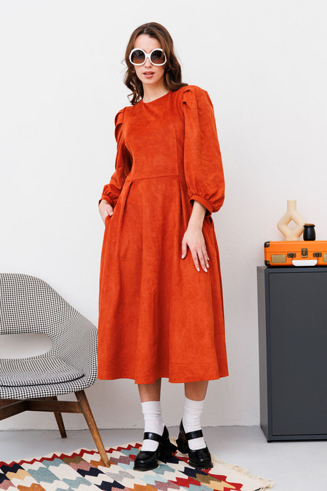 Эффектное платье длиной миди, отрезное по линии талии.По переду нагрудные вытачки переведены в талиевые. Лиф спинки со средним швом, талиевыми и плечевыми вытачками. Юбка со складками на линии талии, расширена к низу. В среднем шве спинки застежка на потайную молнию. Горловина обработана обтачкой. Рукава широкие, втачные,одношовные. По окату рукава заложены мягкие складки. Нижний срез рукава со сборкой. Карманы в боковых швах. В комплект к платью ремень не идёт.