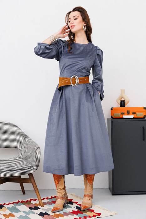 Эффектное платье длиной миди, отрезное по линии талии.По переду нагрудные вытачки переведены в талиевые. Лиф спинки со средним швом, талиевыми и плечевыми вытачками. Юбка со складками на линии талии, расширена к низу. В среднем шве спинки застежка на потайную молнию. Горловина обработана обтачкой. Рукава широкие, втачные,одношовные. По окату рукава заложены мягкие складки. Нижний срез рукава со сборкой. Карманы в боковых швах. В комплект к платью ремень не идёт.