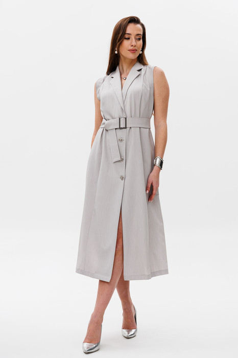 Многофункциональное платье-жилет макси полуприлегающей силуэтной формы без рукавов. Полочка со смещённым бортовым краем назапах, с рельефными швами от линии плеча до низа. Застежка на петли и пуговицы. Спинка со средним швом и талиевыми вытачками. Воротник отложной с отрезной стойкой. В комплект входит пояс из основной ткани с отделочной пряжкой. Идеально комплектуется с брюками в качестве удлиненного жилета.