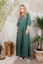 Платье длиной миди полуприлегающего силуэта отрезное по линии талии. Верхняя часть переда со средним швом и вытачкой , нагрудная вытачка объединена с талиевой вытачкой. Нижняя часть переда со средним швом и талиевыми вытачками. Вытачки верхней и нижней частей переда расположены на одной оси. Верхняя часть спинки со средним швом и талиевой вытачкой. Нижняя часть спинки со средним швом, талиевой вытачкой. Рукав втачной двухшовный. В шве по переднему перекату располагается разрез. Вырез горловины круглой формы, обработан обтачками. Застежка в среднем шве спинки на потайную тесьму-молнию. Платье декорировано тесьмой из пайеток.