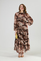 Платье состоит из двух платьев: нижнего и верхнего. Верхнее платье макси прямого свободного силуэта с воланом по низу изделия. Рукав втачной с притачным манжетом. Горловина обработана плосколежащим воротником из отделочной ткани фигурной формы. Центральная застёжка на петли и пуговицы. Нижнее платье комбинация на регулируемых бретелях.