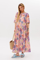 Платье прямого свободного кроя длиной миди, отрезное выше линии талии с двумя настрочными фигурными кулисами по переду и спинке. В кулисы вставлена шляпная резинка с фиксаторами по бокам. Воротник стояче-отложной рубашечного типа. Центральная застёжка на петли и пуговицы. Рукав втачной со сборкой по окату. Фигурная линия низа. В комплект входит деталь, имитирующая жилет. Фиксируется на декоративную тесьму и полукольца. Фурнитура может отличаться от фото.