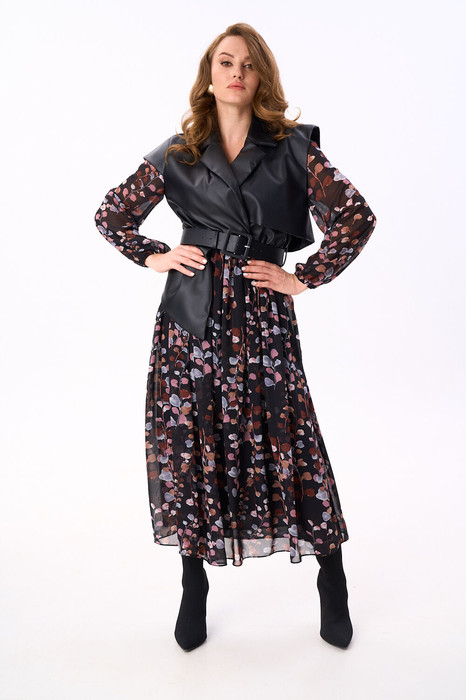 Платье комбинированное, состоящее из основной ткани и отделочной. Имитация верхнего жилета из экокожи прямого силуэта с воротником пиджачного типа. По правой пройме переда расположена фигурная деталь "крылышко". Спинка со средним швом. По низу правого переда и низу правой спинки фигурная деталь. По левой части переда и левой части спинки отлетная кокетка. Рукава одношовные, втачные, длинные со сборкой по линии низа на резинку из отделочной ткани. Юбка прямого силуэта длинная, со сборкой по талии из отделочной ткани. По линии талии платья резинка и шлевки по боковым швам и центральному шву спинки из основной ткани. В комплект к платью идёт ремень с пряжкой.