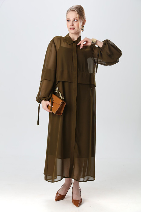 Платье макси с центральной отрезной застёжкой на центральную застежку на петли и пуговицы.По переду и спинке цельнокроеные складки на уровне талии. Рукав втачной,одношовный рубашечного типа. По низу рукава пробиты петли и вставлена завязка для фиксации сборки . Воротник рубашечный стояче отложной. В комплект идёт пояс из основной ткани.