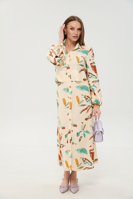 Платье макси с центральной отрезной застёжкой на потайную планку на петли и пуговицы.По переду и спинке цельнокроеные складки на уровне талии. Рукав втачной,одношовный рубашечноно типа. По низу рукава пробиты петли и вставлена завязка для фиксации сборки . Воротник рубашечный стояче отложной. В комплект к изделию идёт пояс из основной ткани для максимально комфортного регулирования объёма.