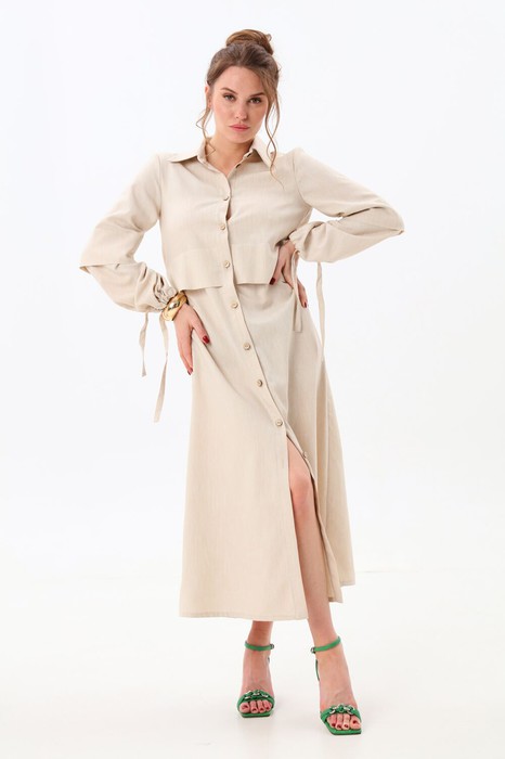 Платье макси с центральной отрезной застёжкой на потайную планку на петли и пуговицы.По переду и спинке цельнокроеные складки на уровне талии. Рукав втачной,одношовный рубашечноно типа. По низу рукава пробиты петли и вставлена завязка для фиксации сборки . Воротник рубашечный стояче отложной. В комплект к изделию идёт пояс из основной ткани для максимально комфортного регулирования объёма.