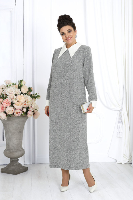 Платье женское полуприлегающего силуэта, выполнено из трикотажного полотна с фактурной лицевой стороной «люрекс». Модель с карманами в боковых швах, на трикотажной подкладке, с плечевыми накладками. Перед с нагрудными вытачками, направленными от пройм. В верхней части среднего шва спинки расположена застежка на тесьму-«молнию» (50 см), в нижней - разрез. Круглая горловина оформлена съемным воротником, декорированным спереди пришивными камнями. Рукав длинный, втачной, низ оформлен съемной манжетой с разрезом. Воротник и манжеты выполнены из сатина и пристегиваются к изделию при помощи прорезных петель и пуговиц.