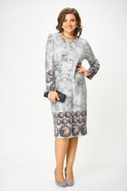 Платье женское полуприлегающего силуэта, выполнено из трикотажного полотна с фактурной лицевой стороной «люрекс». Модель с карманами в боковых швах, на трикотажной подкладке, с плечевыми накладками. Перед с нагрудными вытачками, направленными от пройм. В верхней части среднего шва спинки расположена застежка на тесьму-«молнию» (50 см), в нижней - разрез. Круглая горловина оформлена съемным воротником, декорированным спереди пришивными камнями. Рукав длинный, втачной, низ оформлен съемной манжетой с разрезом. Воротник и манжеты выполнены из сатина и пристегиваются к изделию при помощи прорезных петель и пуговиц.