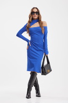 Это не просто платье — это воплощение вечерней роскоши и утончённого стиля. Бархатистый велюр сияет в свете софитов, обволакивая фигуру мягким, но точным прилегающим силуэтом. Каждое движение в нём - как на красной дорожке. Асимметричный крой и эффектная драпировка с перекрутом на талии создают идеальные пропорции, превращая силуэт в произведение искусства. Высокий разрез спереди добавляет смелую, но благородную нотку, а длинные рукава и элегантная округлая горловина сохраняют изысканную сдержанность. Это платье создано для свадеб, торжеств, гала-ужинов и особых вечеров, когда каждая деталь должна подчеркивать ваш высокий вкус и статус.