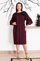 Платье полуприлегающего силуэта, выполнено из фактурного трикотажного полотна с рубчиком. На продолжении боковых швов, в нижней части платья – притачные клинья, придающие силуэту расширение к низу. Модель без подкладки, без застежки и плечевых накладок. Перед с нагрудными вытачками, направленными от пройм, спинка – с талиевыми. В верхней части переда настрочен фигурный накладной карман. Круглая горловина оформлена бейкой из основного полотна. Рукав длинный, реглан, с притачной манжетой без застежки. Боковые клинья платья, детали рукава и карман выполнены из гладкого отделочного трикотажного полотна. Длина платья – 110 см; длина рукава (от горловины, с манжетой) – 71 см.