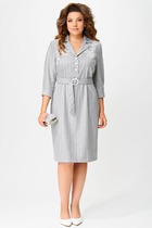 Платье женское полуприлегающего силуэта, выполнено из трикотажного полотна с фактурной лицевой стороной «люрекс». Модель на трикотажной подкладке, с плечевыми накладками. На правой части переда, вдоль отрезного пояса, заложены косые односторонние складки; детали лифа и юбки скреплены на запах. Низ платья асимметричный: правая часть переда удлинена к центру и оформлена углом, левая -- скругленная и входит в правый боковой шов. На спинке обработаны талиевые вытачки. В левом боковом шве предусмотрена застежка на потайную тесьму-«молнию» (35 см). Рукав длиной 3/4, втачной. Платье дополнено съемным «цветком» из основного полотна. Длина платья-108 см; длина рукава-41 см.