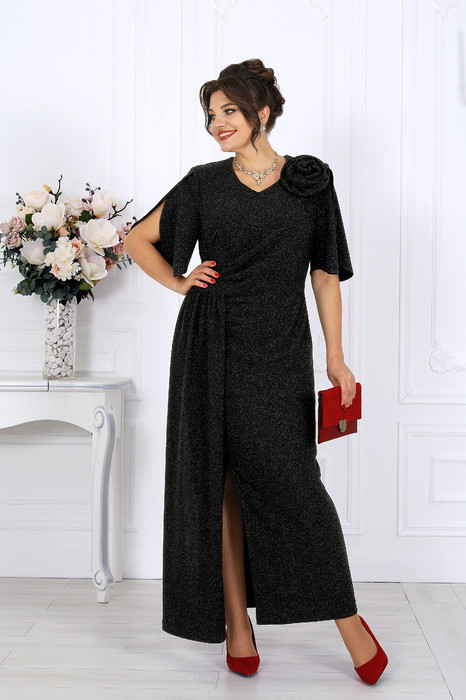 Платье женское полуприлегающего силуэта, выполнено из трикотажного полотна с фактурной лицевой стороной «люрекс». Модель на трикотажной подкладке, с плечевыми накладками. В левом боковом шве обработана застежка на потайную тесьму-«молнию» (35 см). Перед платья с горизонтальным подрезом по линии талии и отлетной деталью в шве подреза. В правой части переда обработан рельеф с разрезом в нижней части. Вдоль рельефного шва заложены односторонние складки, направленные к центру переда. Спинка с талиевыми вытачками. Горловина спинки округлая, по переду V-образная, углубленная. Рукав короткий, втачной, формы «крылышко на запах», со скругленными краями. Платье дополнено съемным «цветком» из основного полотна. Длина платья - 136 см; длина рукава - 31 см.