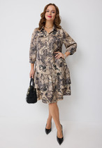 Платье женское полуприлегающего силуэта, выполнено из трикотажного полотна с фактурной лицевой стороной «люрекс». Модель на трикотажной подкладке, с плечевыми накладками и застежкой в левом боковом шве на потайную тесьму-«молнию» (35 см). Перед отрезной по линии талии. Верхняя часть переда состоит из двух деталей, скрепленных на запах; вдоль горизонтального подреза заложены односторонние складки. На нижней части переда обработан рельефный шов с двойным воланом в верхней части и разрезом по низу; от шва к центру направлены односторонние складки. На спинке обработаны талиевые вытачки. Рукав трехчетвертной. Платье дополнено съемным «цветком» из основного полотна. Длина платья – 134 см; длина рукава – 42 см.