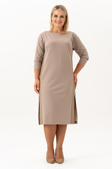 Базовое женское платье прямого кроя больших размеров - это идеальный выбор для создания стильного образа. Трикотажное платье подойдет как для повседневного использования, так и для офиса. Цвет нежного капучино придает глубину и загадочность образу, позволяя легко переходить от дневного к вечернему стилю. Кроме того, модель сочетается с любыми аксессуарами и обувью, что делает его универсальной базой гардероба. Строгий при этом простой и лаконичный дизайн делает его достаточно универсальным, чтобы подходить практически любому типу фигуры. Длинные рукава создают эффектную линию, а удлиненный крой придает ей свободный и стильный вид. Эффектная модель платья идеальный выбор для женщин с пышными формами, которые хотят выглядеть стильно и элегантно. Однотонное платье со спущенным плечом, свободная посадка прямого кроя и приятная немнущаяся ткань идеально садится на большие размеры . Вставка из ткани экокожи добавляет модного акцента. Прямой крой корректирует силуэт визуально делая женскую фигуру более стройной, а длина миди ниже колена позволит скрыть недостатки и фигура приобретет более подтянутый вид. На боковых швах обработаны накладные карманы и разрезы. Платье подчеркнет вашу индивидуальность и станет ярким акцентом в вашем образе.