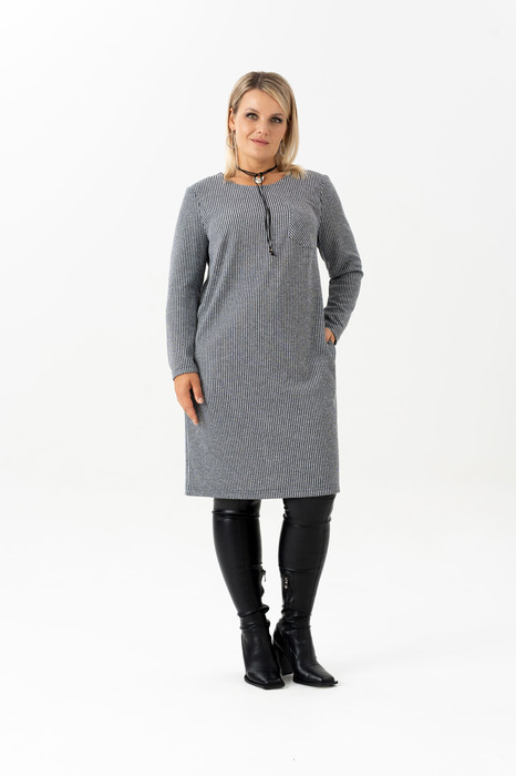Платье с длинным рукавом в полоску - идеальный выбор для женщин, ищущих комфорт и стиль в повседневной одежде. Это платье длинной до колена, созданное без застежки для удобства надевания. Оно идеально подходит для офисной работы, а также для повседневного ношения благодаря своей легкости и практичности. Отсутствие подкладки делает его особенно удобным. Платье обеспечивает идеальный силуэт. Оно прекрасно сядет на любую фигуру. Фактура ткани добавляет текстуру и интерес к внешнему виду платья. Платье прямого силуэта с нагрудными выточками и накладным карманом в области груди. На платье обработаны карманы в боковых швах. Рукав длинный. Благодаря малой сминаемости трикотажа , вам практически не придется утюжить или отпаривать платье. Это изделие прямого свободного кроя позволяет не изменять любимому стилю и выглядеть всегда женственно и даже в холода: в осенний, зимний и весенний период. Чудесное платье на каждый день для девушки, стремящейся выглядеть модно. Платье большого размера отлично подойдет для работы, офиса и деловых встреч.