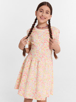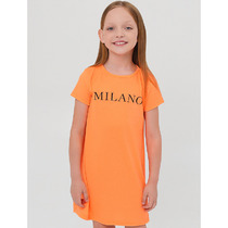 Платье для девочки из натуральной хлопковой ткани кулирки. Силуэт расширенный от линии груди, спереди и сзади подрез, нижняя часть со сборкой. Спереди пришита широкая рюша с обметанными краями, рукав втачной короткий, горловина окантована, сзади капелька с пуговкой.