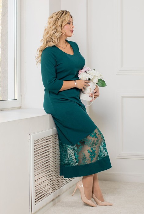 Элегантное праздничное платье длиной maxi, выполнено из эластичного трикотажного полотна. Перед и спинка целые, по спинке две вертикальные вытачки. По низу платья фигурная вставка из прозрачной отделочной ткани сетка с вышивкой. V-образный вырез горловины переда и горловина спинки обработаны обтачками. Рукав втачной, прямой длиной 3/4. Длина рукава от плечевой точки в 48 р-ре – 43 см. в 58 р-ре – 45 см., ширина рукава по низу в 48 р-ре – 27 см. в 58 р-ре – 34 см. Платье без застежек и подклада. Длина изделия по спинке в 48 р-ре – 127 см. в 58 р-ре – 134 см.