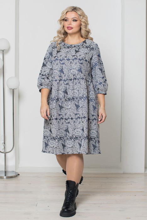 Молодежное нарядное платье, свободного силуэта, выполнено из жаккардового полотна. Платье с отрезной фигурной линией талии со сборкой по шву притачивания. По переду линия талии слегка завышена, по спинке – занижена. В боковых швах юбки удобные карманы. Верх платья по переду с 2-мя нагрудными вытачками, по спинке со средним швом. Овальный вырез горловины по переду и горловина спинки обработаны обтачками. Рукав втачной свободный, с узким притачным манжетом по низу. По шву притачивания менжет сборка. Длина рукава от плечевой точки в 46 р-ре – 44 см. в 60 р-ре – 48 см., ширина рукава по низу в 46 р-ре – 30 см. в 60 р-ре – 37 см. Платье без застежек и подклада. Длина изделия по спинке в 46 р-ре – 100 см. в 60 р-ре 106 см.