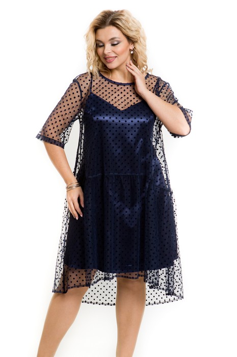 Нарядное платье свободного силуэта выполнено из сетки с бархатным напылением. Перед и спинка платья целые. Платье с ассиметричным фигурным отрезным низом с небольшой сборкой по шву притачивания. Спинка длиннее переда на 12 см. Овальный вырез горловины переда и спинки обработан настрочной окантовкой. Платье с удлиненной линией плеча, рукав втачной прямой. Длина рукава от горловины в 48 р-ре – 43 см. в 58 р-ре – 45 см., ширина рукава по низу в 48 р-ре – 36 см. в 58 р-ре – 42 см. Платье с подкладом. Подклад выполнен отдельно от платья, из тонкого эластичного атласного полотна. Подклад на бретелях, длина бретелей регулируется. Длина подклада без бретелей в 48 р-ре – 80 см. в 58 р-ре –В В 84 см. Платье без застежек. Длина изделия по спинке в 48 р-ре – 112 см., в 58 р-ре -В В 116 см.